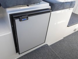 Kuljettajan takana olevassa oleskeluryhmässä aterioi mukavasti jopa neljä aikuista. Patjasarjan kanssa oleskelutila muuntuu kahden hengen vuoteeksi ja kolmas henkilö nukkuu kulkuväylän toisella puolella. Kartturin istuin kääntyy eteen ja alas työtasoksi. Penkin alta löytyy pesuallas ja paikka liedelle. Jääkaapin saa asennettua kuljettajan penkin alle.